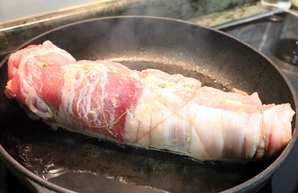 - Doramos el lomo relleno en una sartén por todos sus lados.